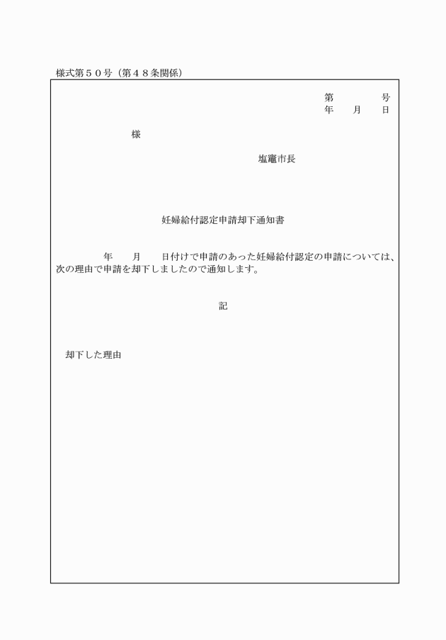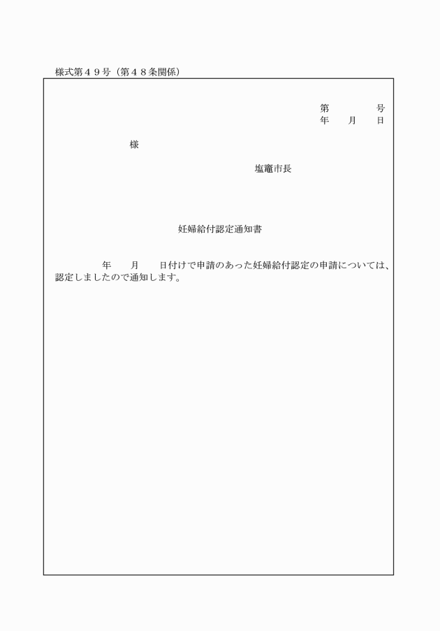 第48条 府令第1条の4の2第1項の申請書は、妊婦給付認定申請書(様式第48号)とする。ただし、母子保健法(昭和40年法律第141号)第15条の規定による妊娠の届出に同項第1号に掲げる事項の記載があるときは、当該妊娠の届出をもって妊婦給付認定申請書の提出に代えることができる。