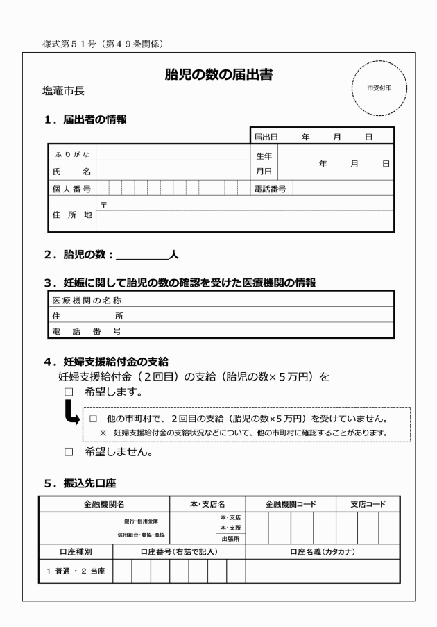 第49条 法第10条の13第1項の規定による届出は、胎児の数の届出書(様式第51号)により行うものとする。