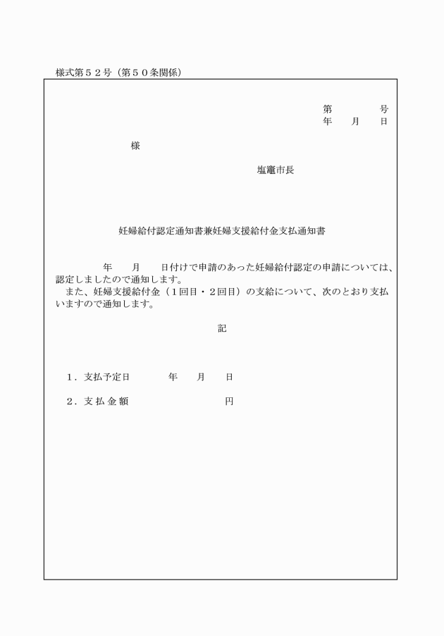 第50条 市長は、妊婦給付認定者に対する妊婦支援給付金の支給を決定し、法第10条の14第1項の規定により当該妊婦給付認定者に妊婦支援給付金を支払おうとするときは、あらかじめ、支払予定日及び支払金額を妊婦給付認定通知書兼妊婦支援給付金支払通知書(様式第52号)により当該妊婦給付認定者に通知する。
